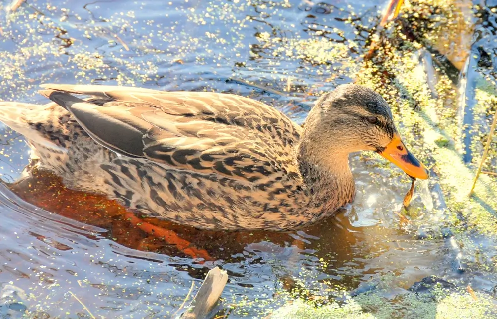 It has a blue patch on the top side of its wings with a white line around it. The female mallard is mottled brown and tan with a white tail and an orange bill.