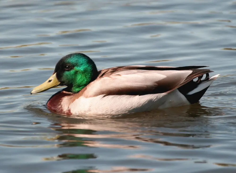 The male mallard has a green head and neck with a white ring at the bottom. It has a brown chest, whitish-gray undersides, brown wings, and a yellow bill.