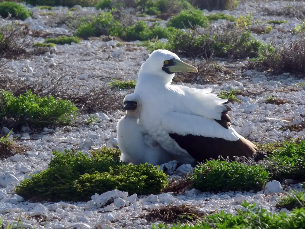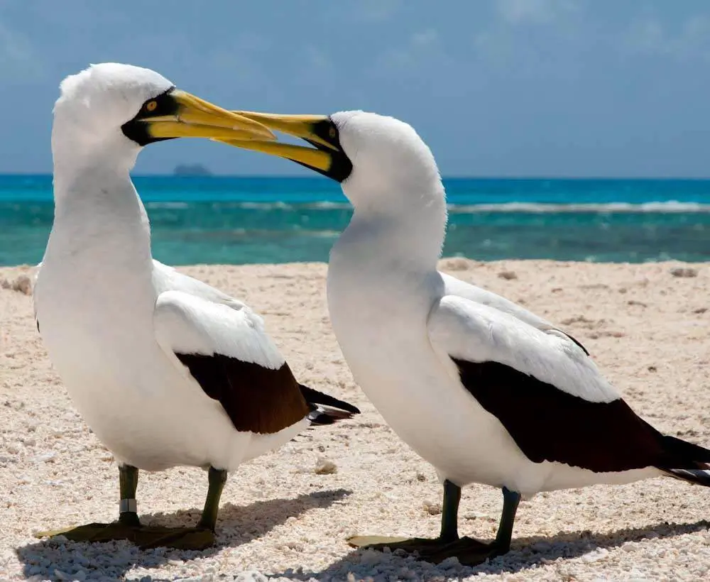 The masked booby nests in large colonies. It makes its nest in a shallow depression on the ground. The female usually lays 1-2 eggs. Both parents incubate the eggs. They use their webbed feet to warm the eggs.