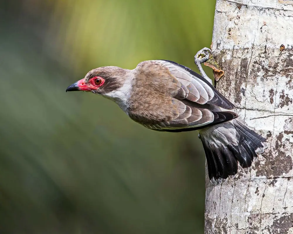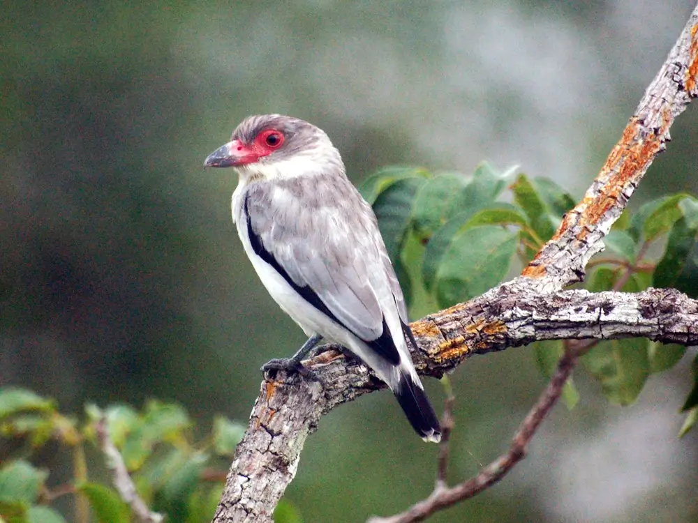 The masked tityra is 7.9-9.4 inches (20-24 cm) in length. It has a thick hooked red bill with a black tip, a black face mask with red around its eyes, a black band on its tail feathers, black flight feathers, and gray legs and feet.