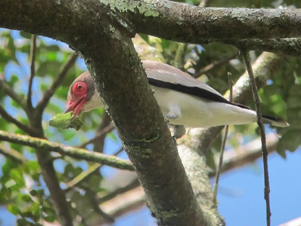The masked tityra travels in pairs or small flocks and feeds on insects, small vertebrates, and fruit.