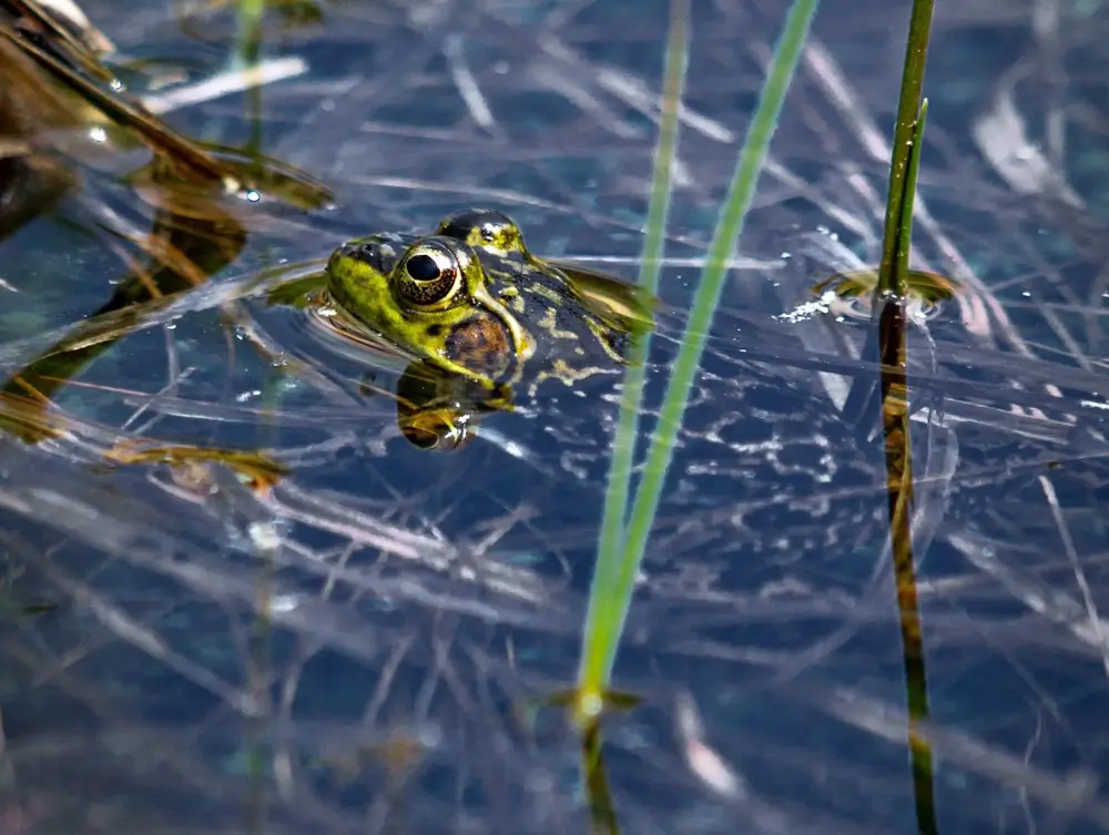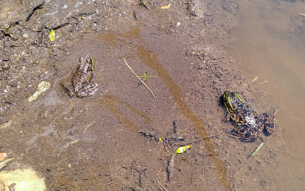 The mink frog is often found near lots of water lilies. The water lilies provide cover from predators and the lily pads are great platforms for the mink frog to hop around on.