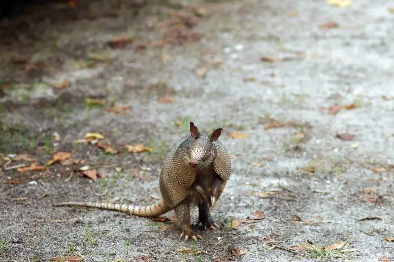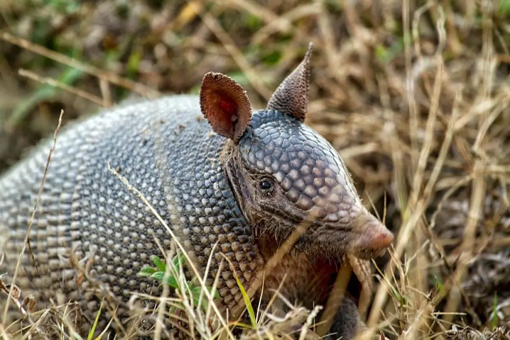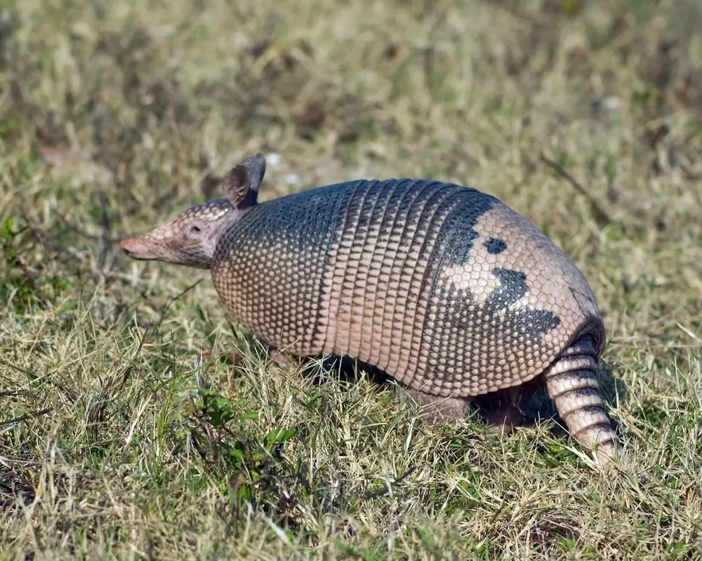 Some people think that the nine-banded armadillo curls itself into a ball when it is frightened. It doesn’t. It usually just runs away. Sometimes, when it is startled, it will jump straight up into the air before taking off running.