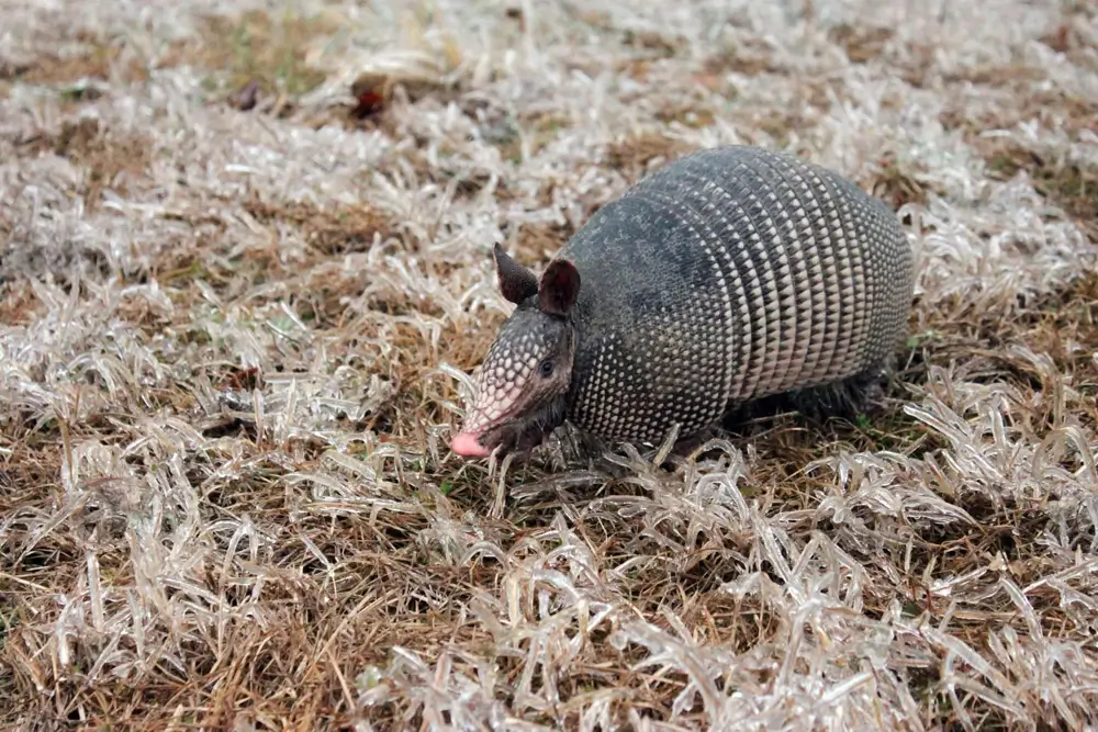 With so little fur, the nine-banded armadillo is very sensitive to temperature. In the winter, it is usually active only during the warmest part of the day. In the summer, it is active at night when it is cooler. If temperatures drop too low, the armadillo can die.