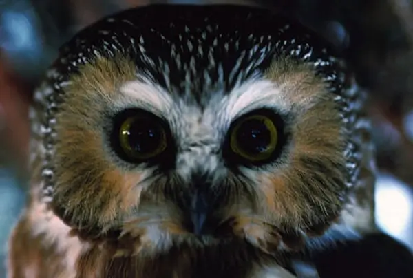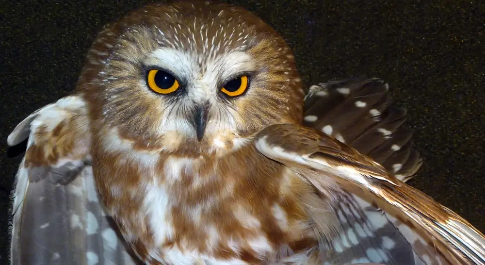 It is medium brown in color with vertical white stripes and easily blends into its surroundings. The northern saw-whet owl has yellow eyes and no ear tufts.