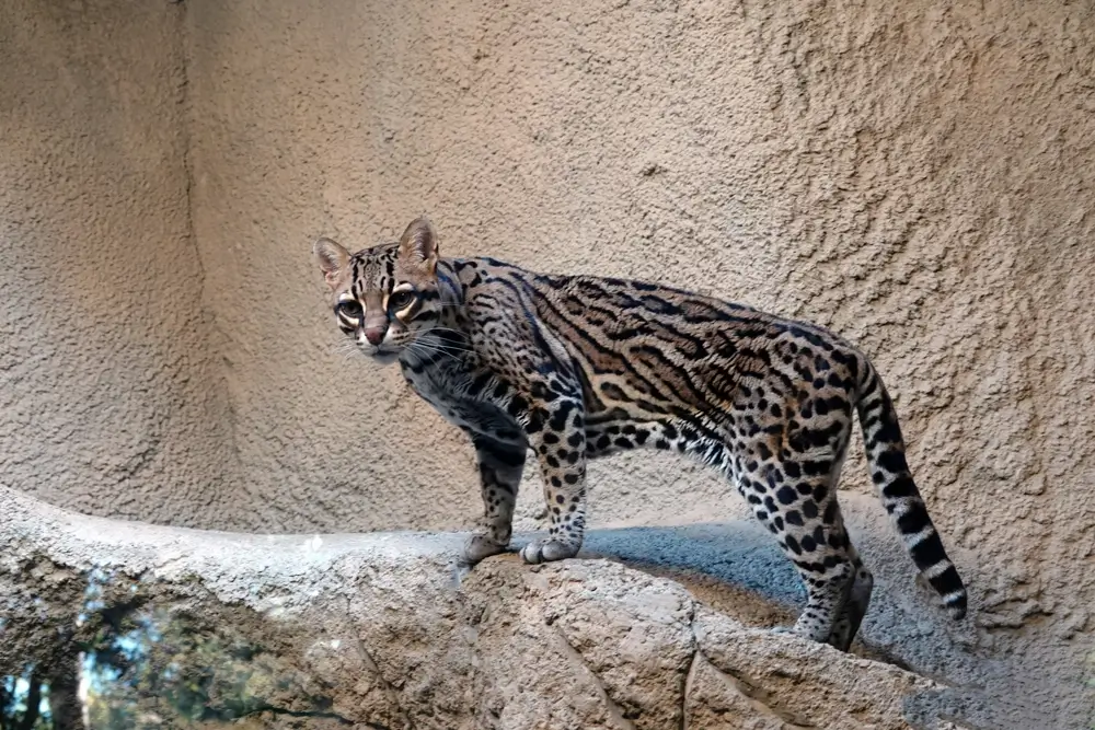 It has gray to golden brown fur. It has brown spots and patches that are bordered in black on its sides. It looks a lot like the margay, but the ocelot’s spots come in many patterns like rosettes, slashes, speckles, and bars.