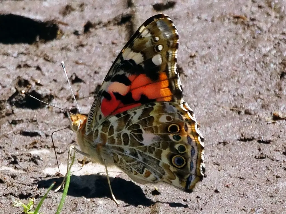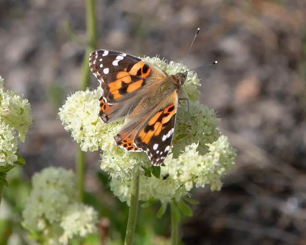 The painted lady has a wingspan of 2-3 inches (5-7.6 cm). It has scalloped orange wings with black patches. The tips of its forewings are black with white splotches. Its underside is a mottled gray, brown, and black with four eyespots.