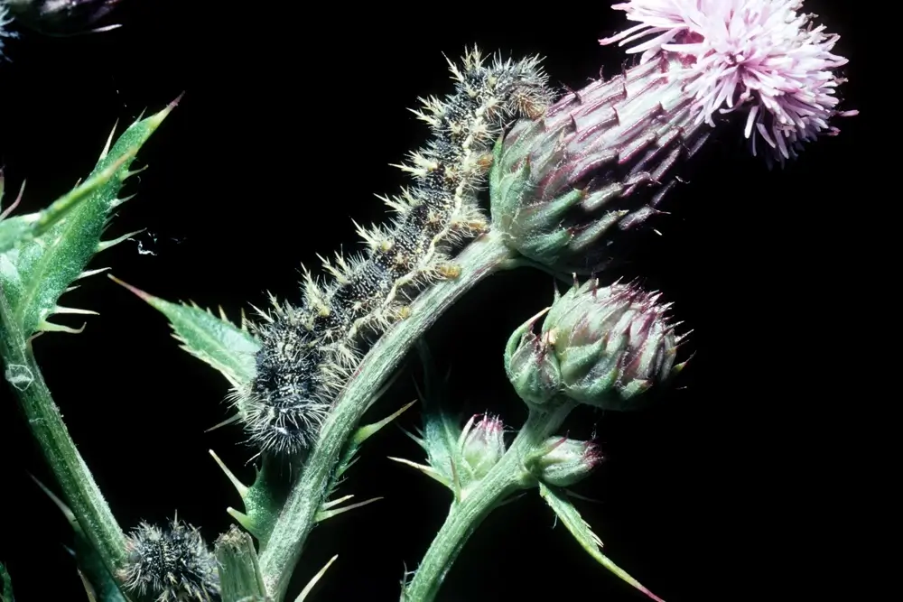 The female painted lady lays single pale green eggs on host plants. The eggs hatch in 3-5 days. The caterpillar is purple to black in color and has yellow and green strips and is covered in spines. It pupates in 5-10 days. The painted lady butterfly emerges from the chrysalis in 7-10 days.
