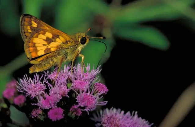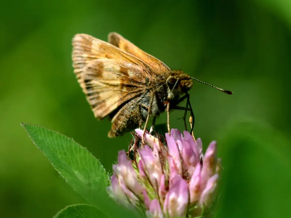 The Peck’s skipper caterpillar eats grasses like rice cutgrass and bluegrass. The adult eats nectar from plants like red clover, purple vetch, thistles, New York ironweed, milkweed, and dogbane.