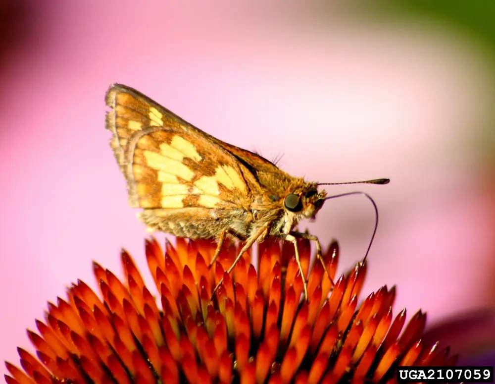 Peck’s skipper has a wingspan of 1-1.25 inches (2.5-3.1 cm). It has dark brown uppersides, small orange flecks on its forewing, and an orange patch on its hindwing. The underside of the hindwing has a patch of pale yellow spots surrounded by brown. The male has a curved black stigma, or scent patch, on his forewing.
