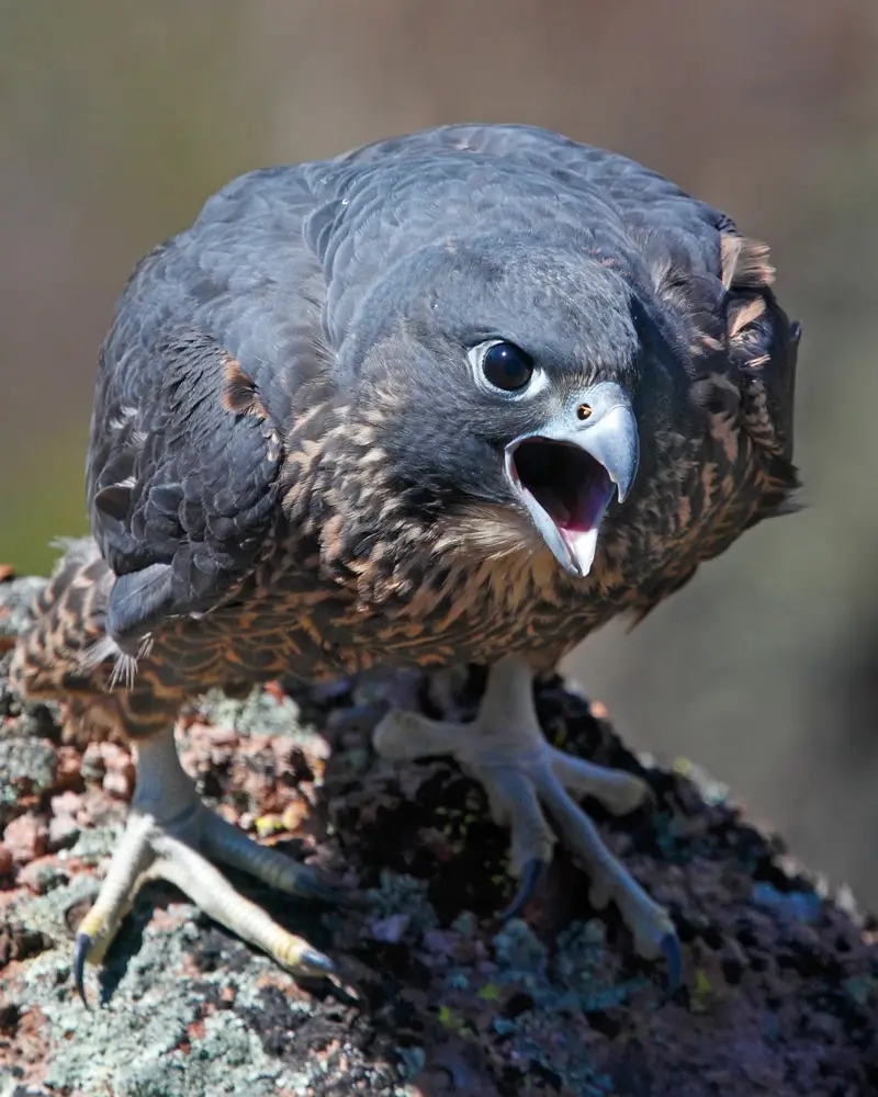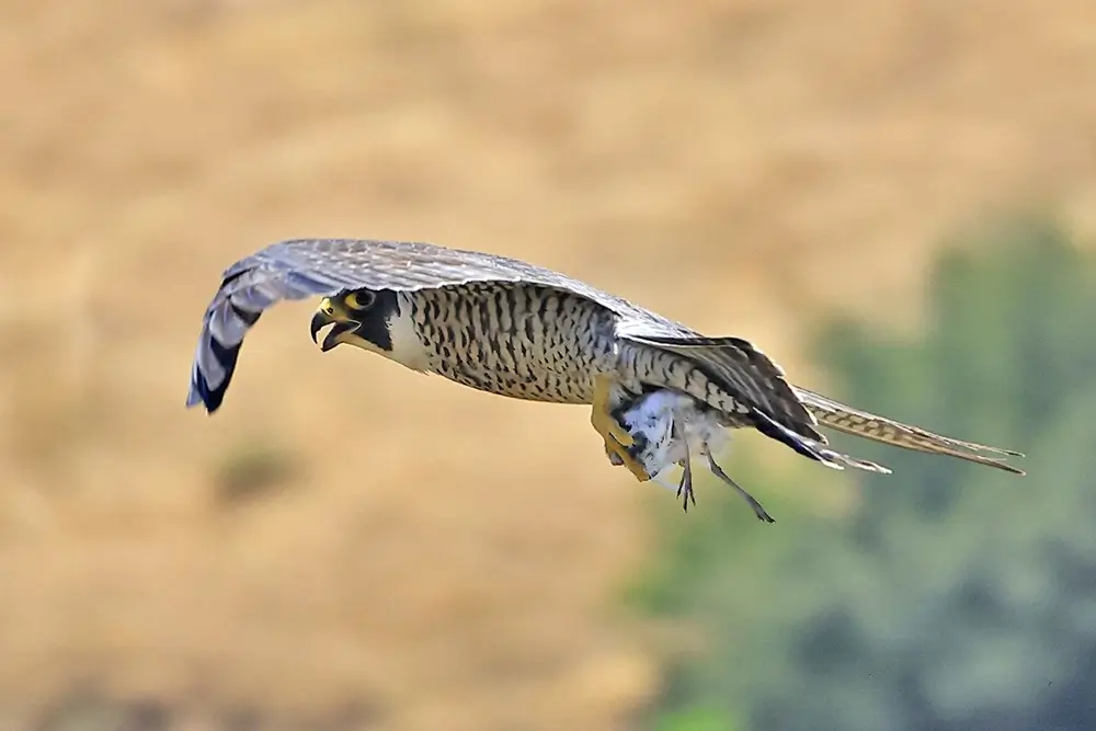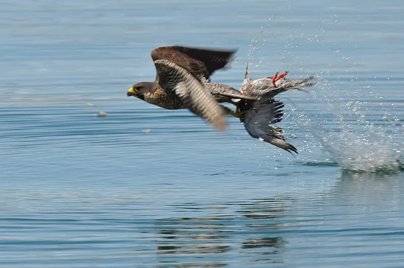 The peregrine falcon hunts in the air or from a perch. It hunts for birds and either dives on its prey from above or chases it from behind. It captures its prey with its strong, sharp talons. It is estimated that the peregrine falcon can dive at speeds of up to 200 miles per hour.