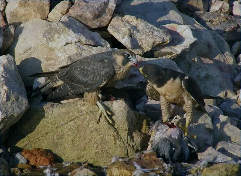 Male and female peregrine falcon pairs mate for more than one year. They return to the same area every year to breed. The male performs aerial displays to court the female. The pair make a nest on a cliff ledge or other high perch. The nest is just a depression in the ground lined with grass, gravel, and dirt. Occasionally a pair will nest in a tree cavity or the abandoned nest of another bird. In urban areas, pairs may nest on tall buildings, towers, or bridges.