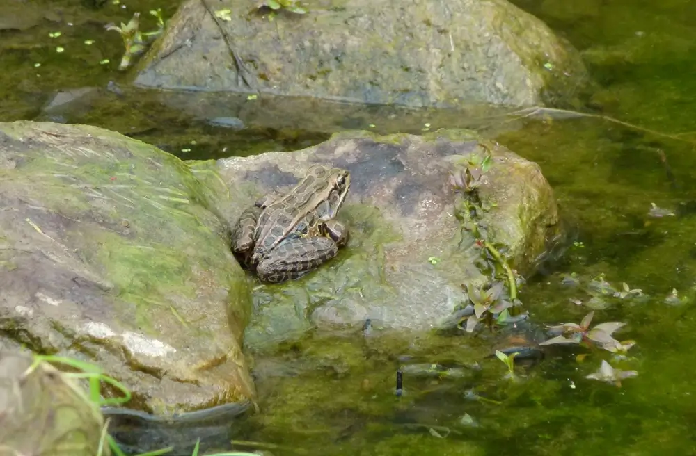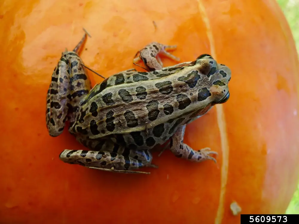 It is sometimes confused with the northern leopard frog. The northern leopard frog looks similar, but its spots are round and randomly scattered on its body, and it doesn’t have patches of bright yellow or orange skin on the inside of its thighs.