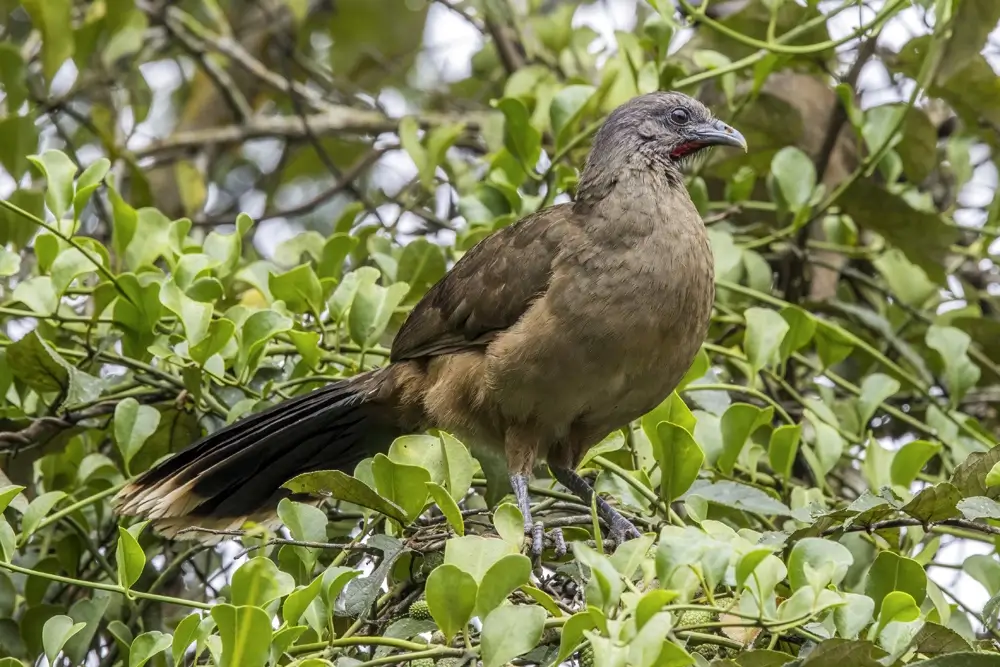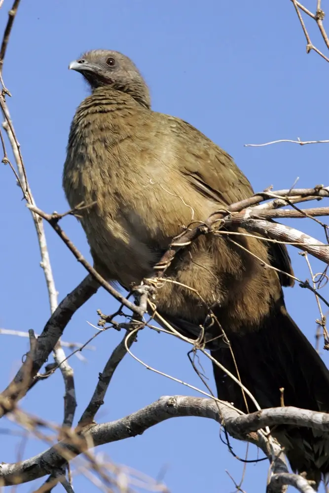 The plain chachalaca is a very noisy bird. At dawn and sunset, groups of them call loudly from the treetops.