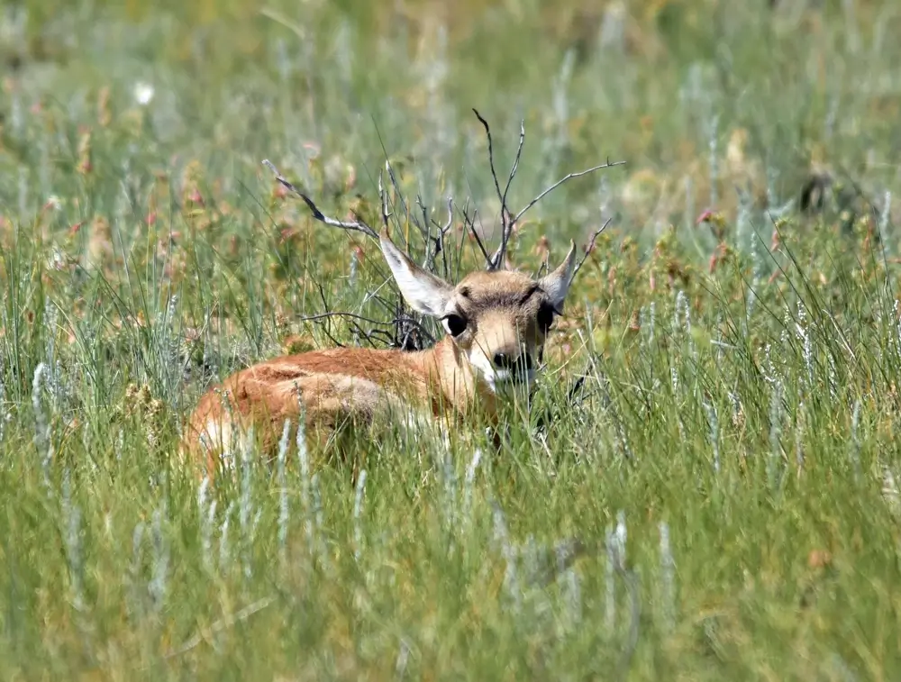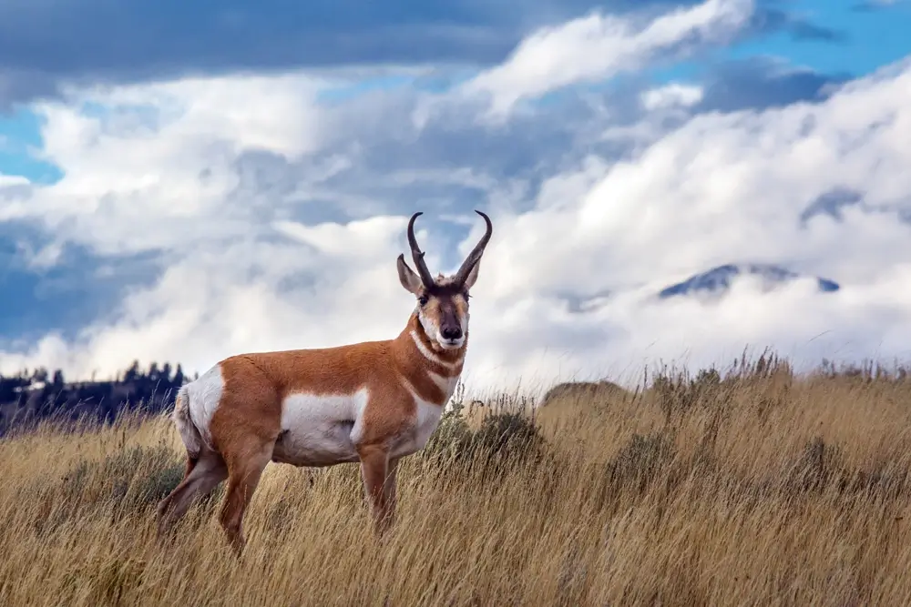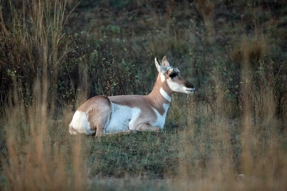 The pronghorn has horns, not antlers. The male’s horns are lyre-shaped and curve in towards each other. The female does not have the black markings, and her horns are usually straight, short spikes between 3-4 inches (7.6-10.2 cm) in length.
