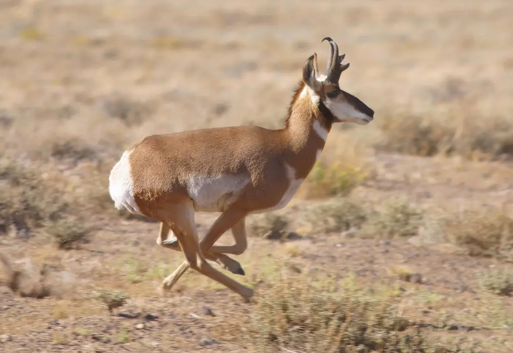 When the pronghorn runs, its mouth is open to help it breathe in extra oxygen. Speed is important because the pronghorn lives in open areas, where there is no place to hide from a predator. It has to be able to run away.