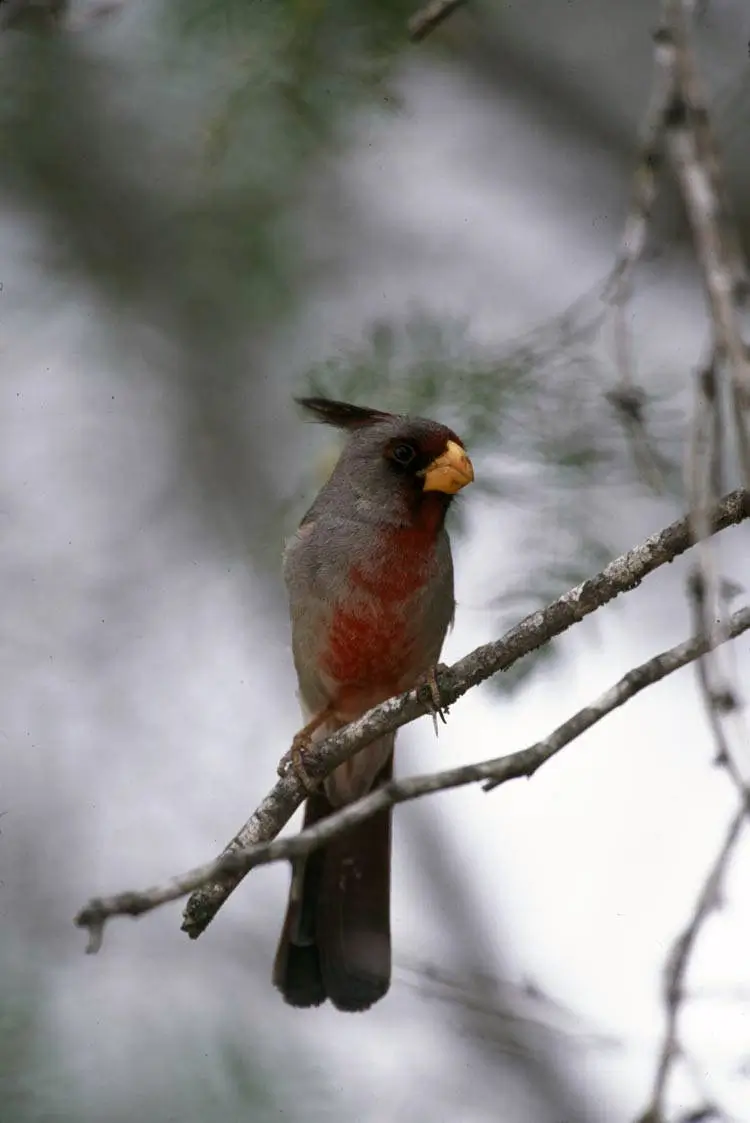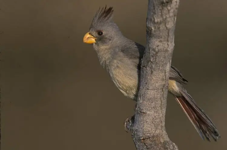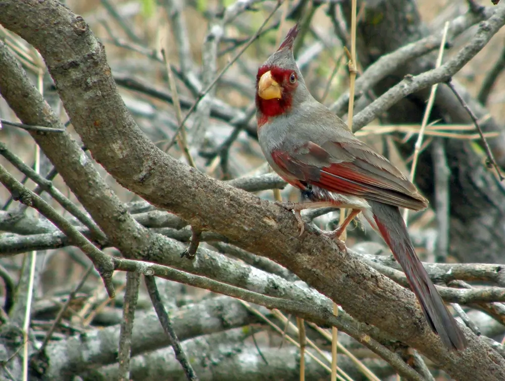 The pyrrhuloxia has a thick, yellow parrot-like bill that it uses to crack open seeds.