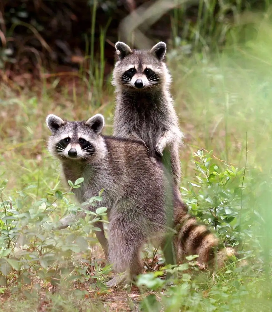 The mother also teaches them how to hunt for food and climb trees. She is very protective of her young and attacks predators that come too close. Young raccoons have darker coats than mature raccoons. The kits may stay with their mother for up to a year.