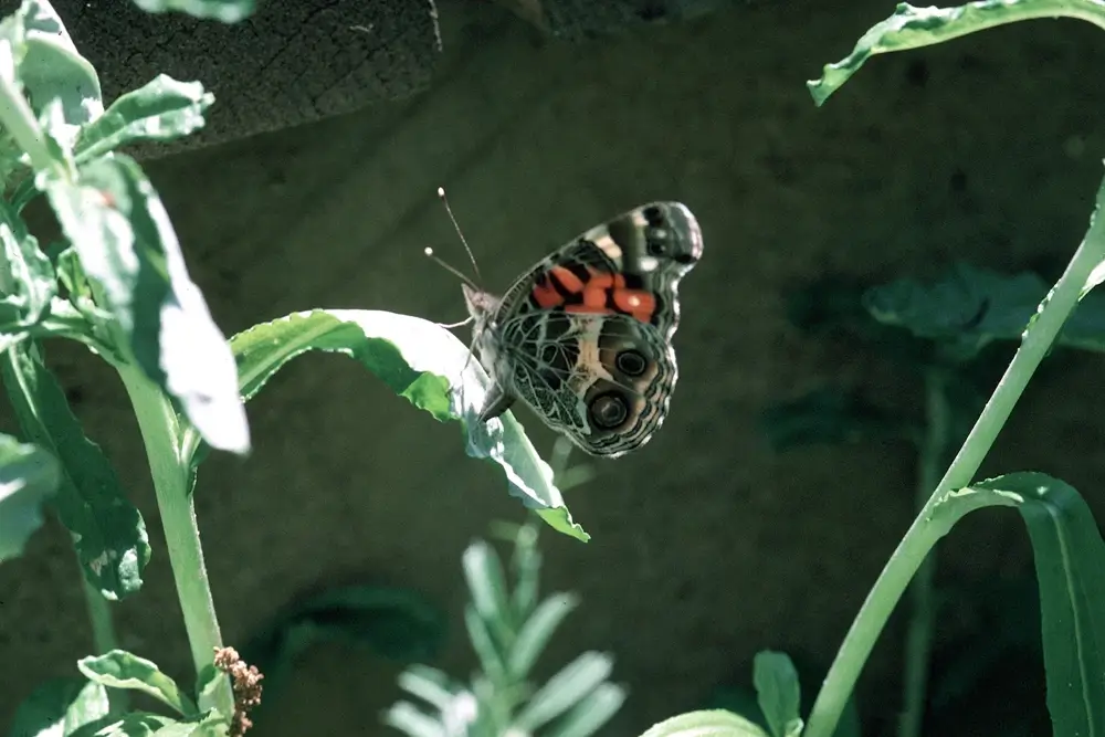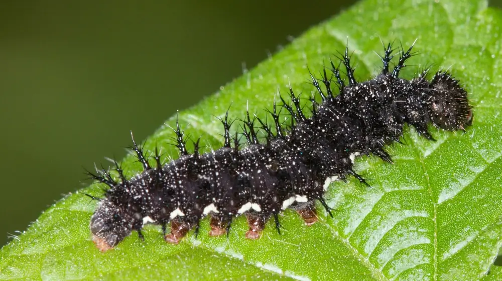 The female red admiral lays greenish eggs on a host plant, usually a nettle. The red admiral caterpillar encases itself inside a host plant’s leaf by wrapping the leaf in silk. It then feeds on the leaf.