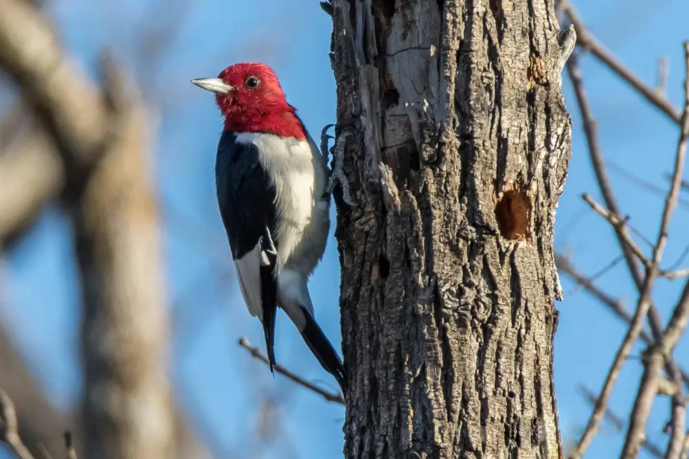The red-headed woodpecker is one of only four species of woodpecker that store food. It hides food in crevices in trees, under the bark of trees, in fence posts, and even under shingles on roofs. The red-headed woodpecker may even wedge a live grasshopper or beetle into a crevice to eat later.