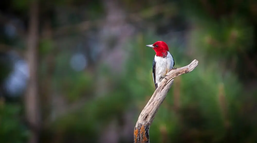 The red-headed woodpecker is found in open woodlands, forest edges and clearings, river bottoms, orchards, parks, open woods, wooded swamps, and grasslands with trees. It especially likes areas with dead or dying trees.