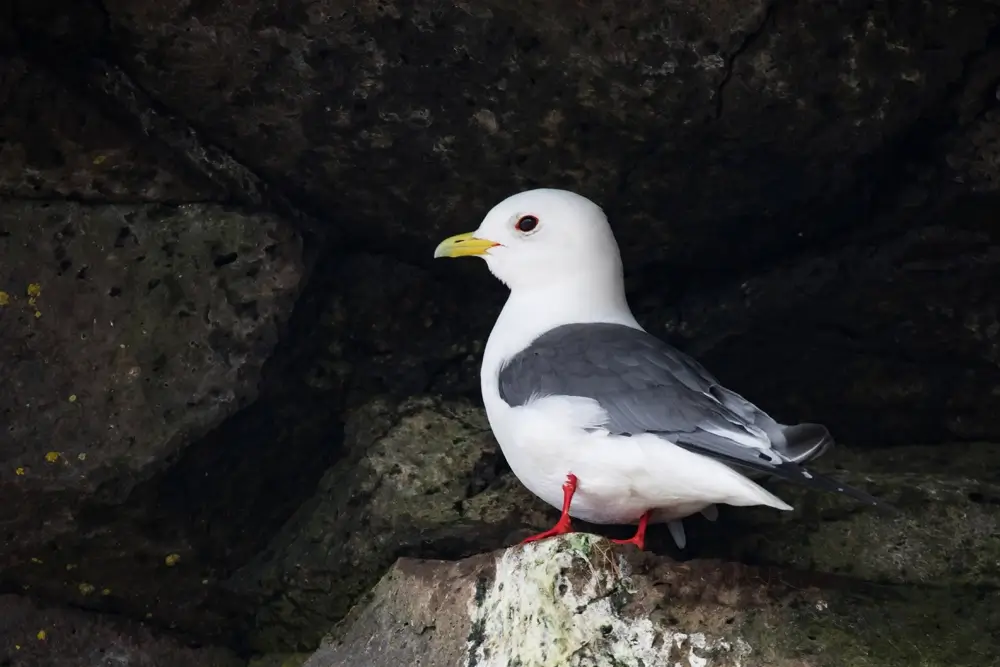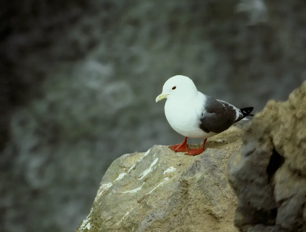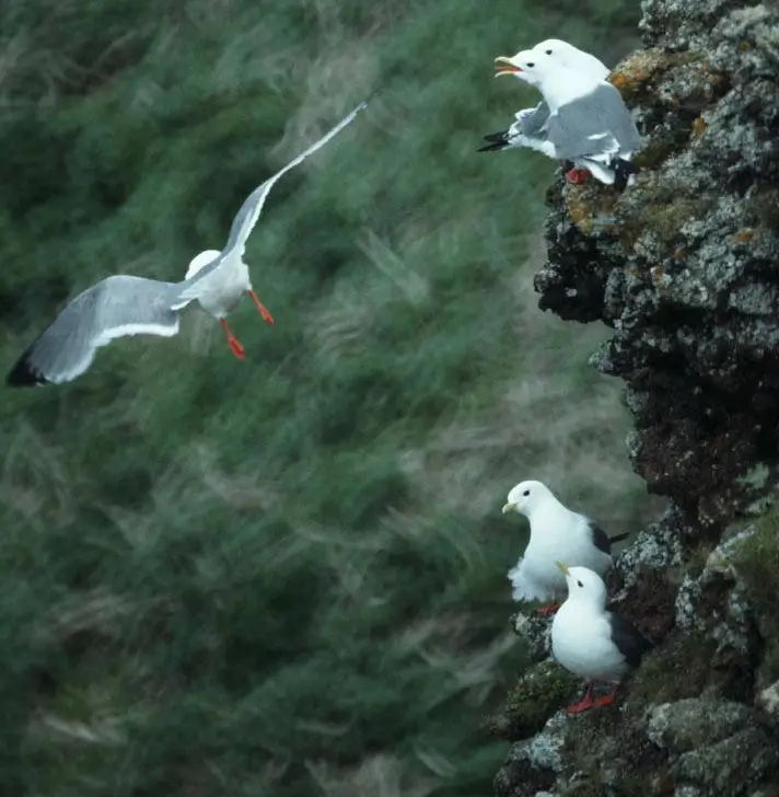 The red-legged kittiwake is found on sea cliffs and ledges during the breeding season. It winters on the open ocean.