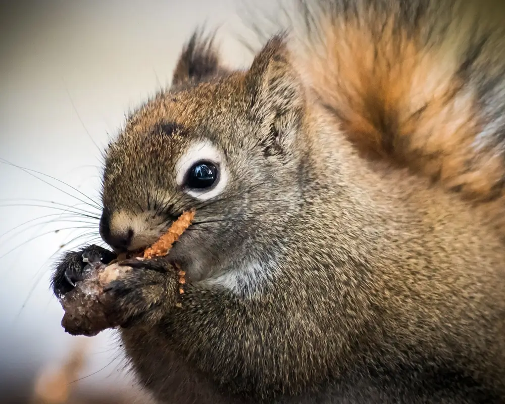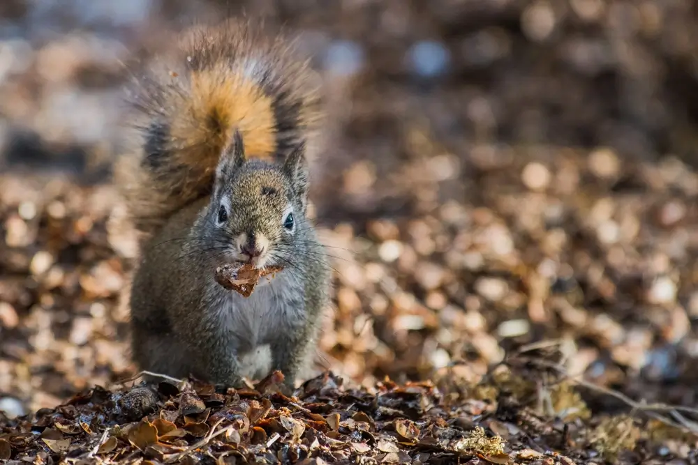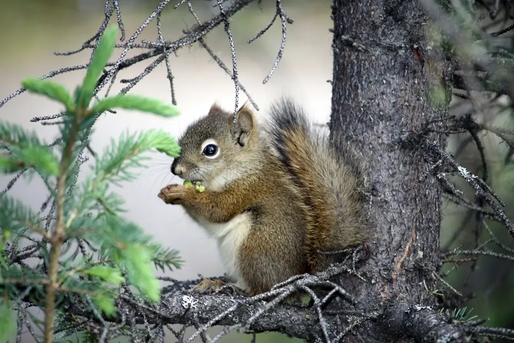 In the fall, the red squirrel cuts green pine cones from trees and stores them in the ground. It also stores nuts and seeds in piles known as middens under logs, at the base of trees, and underground. It doesn’t always find or eat all of the seeds and nuts it has stored. Because of this, the red squirrel fills an important niche in spreading seeds in the forest.