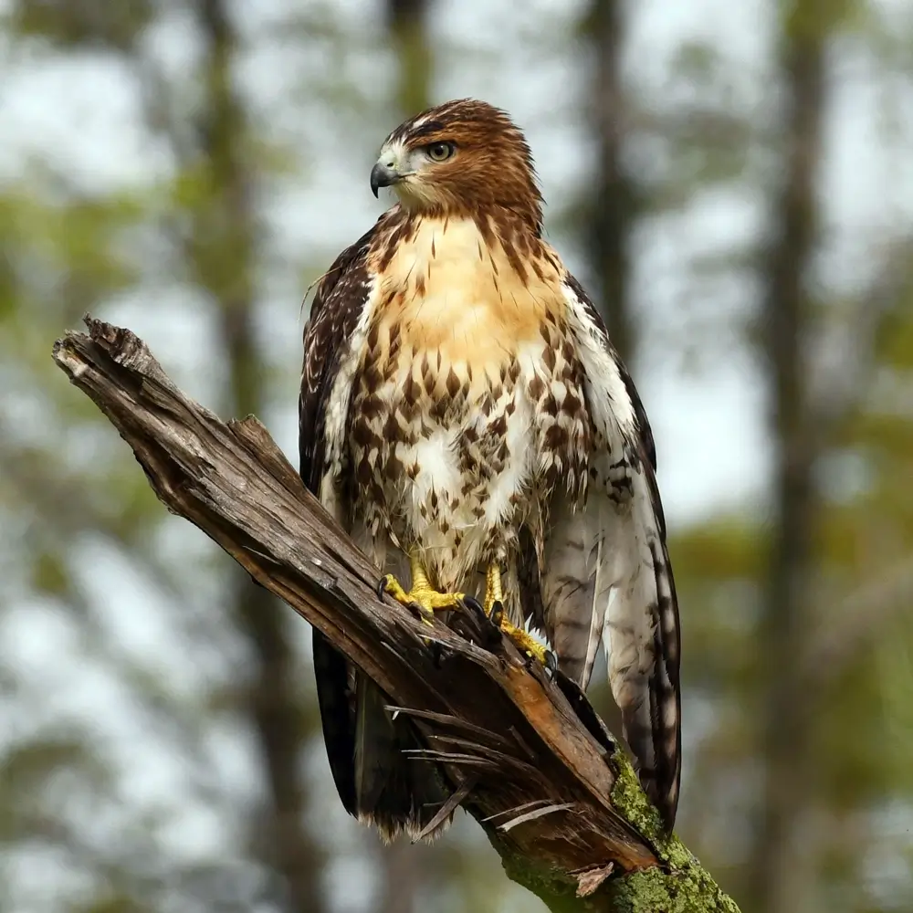 The red-tailed hawk lives in deciduous forests and open areas like swamps, deserts, tundra, plains, and agricultural areas.