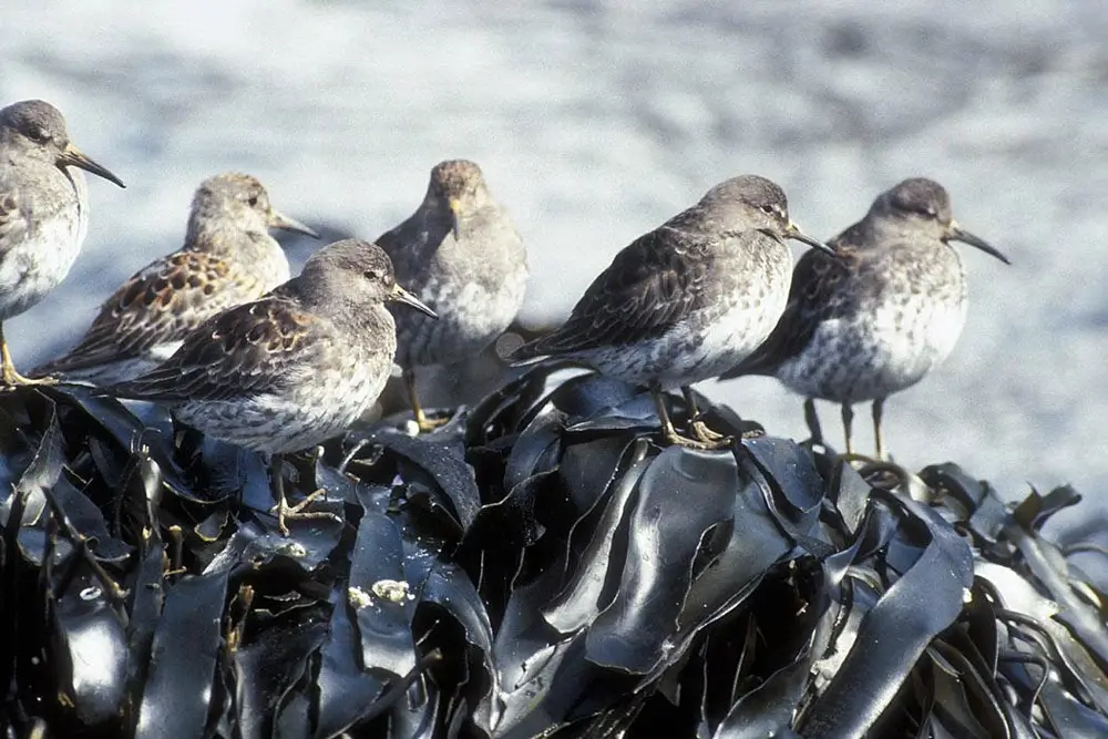 The rock sandpiper eats a wide variety of food, including seeds, berries, moss, and algae. In the winter, it eats mollusks, crustaceans, and marine worms