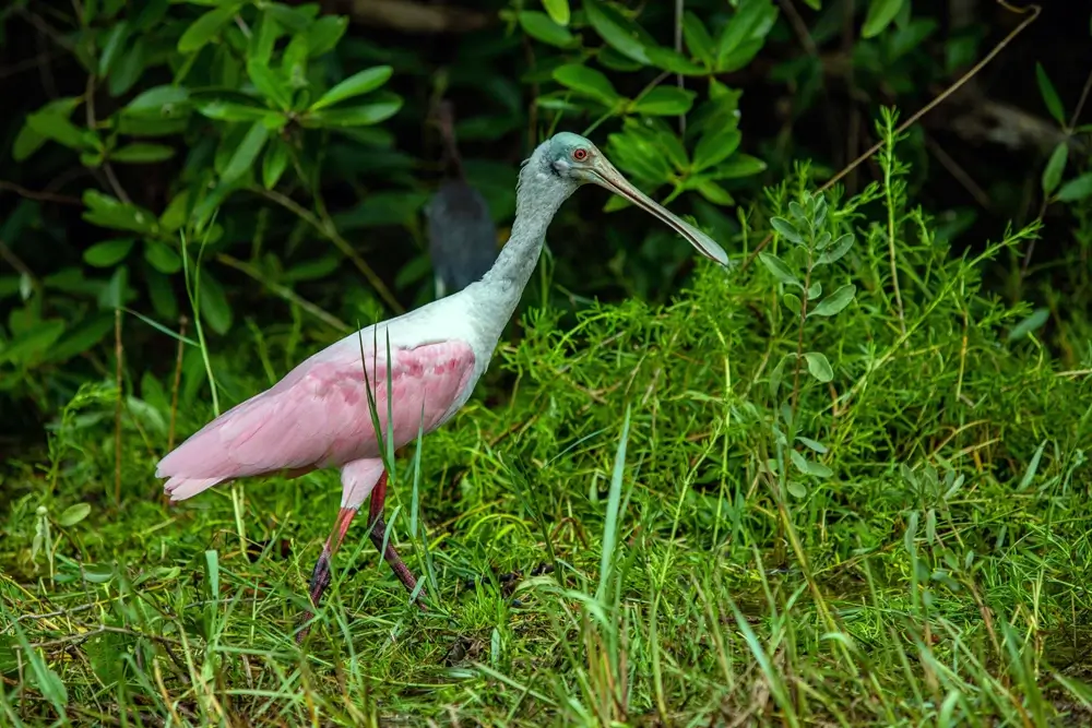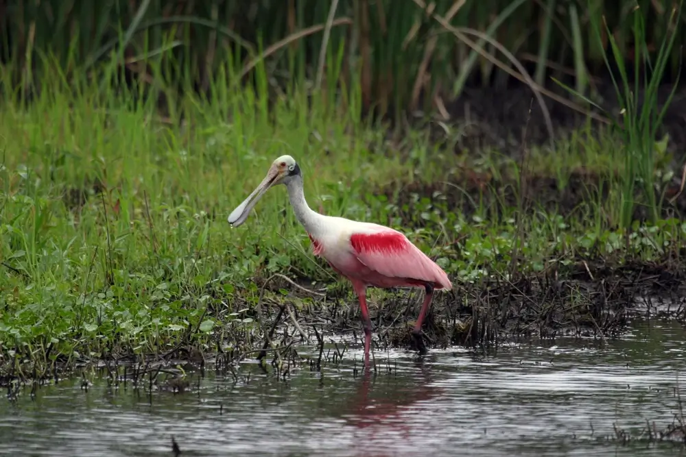 The most distinctive characteristic of the roseate spoonbill is its long, spoon-shaped bill. It has a white head and chest, light pink wings with a darker pink fringe, and very long pink legs. Both males and females have the same plumage and coloring.