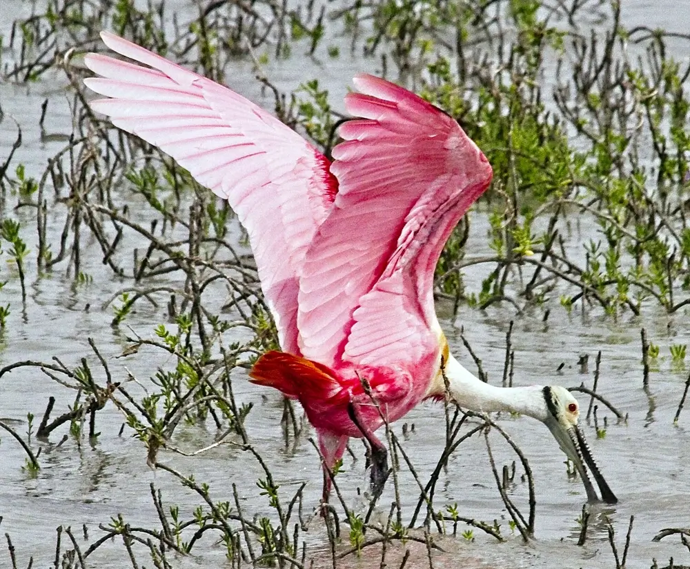 The roseate spoonbill spends a lot of its time in shallow water feeding. It sweeps its open bill from side to side in the water to sift up food like small fish, shrimp, mollusks, snails, and insects. It has touch receptors in its bill that help it feel its prey.