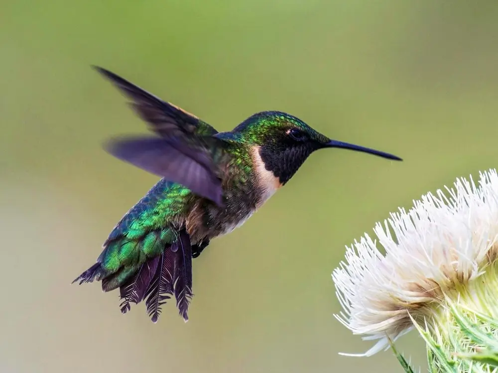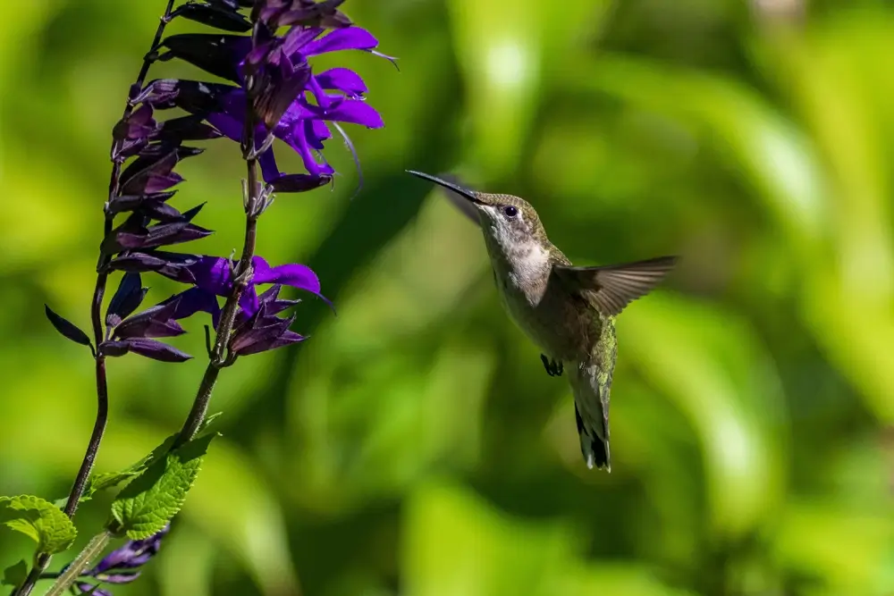 The ruby-throated hummingbird hovers over a flower and uses its long tongue to collect nectar. It is especially attracted to red tube-shaped flowers and often eats the nectar of salvia, trumpet creeper, bee balm, thistle, petunia, coral honeysuckle, wild bergamot, cardinal flower, buckeye, jewelweed, and columbine. It can eat its own weight in nectar each day.