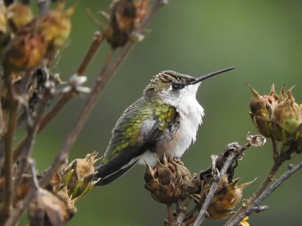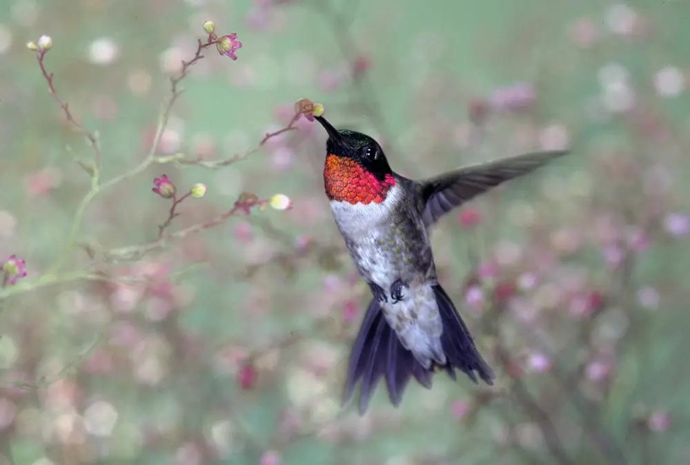 The ruby-throated hummingbird breeds in New Hampshire and migrates south in the late summer.