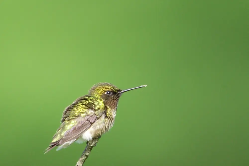 The ruby-throated hummingbird is the only species of hummingbird that breeds in eastern North America. It is 2.8-3.5 inches (7-9 cm) in length with a wingspan of 3.1-4.3 inches (8–11 cm). It weighs only 0.071-0.212 ounces (2-6 g), about the weight of a penny.