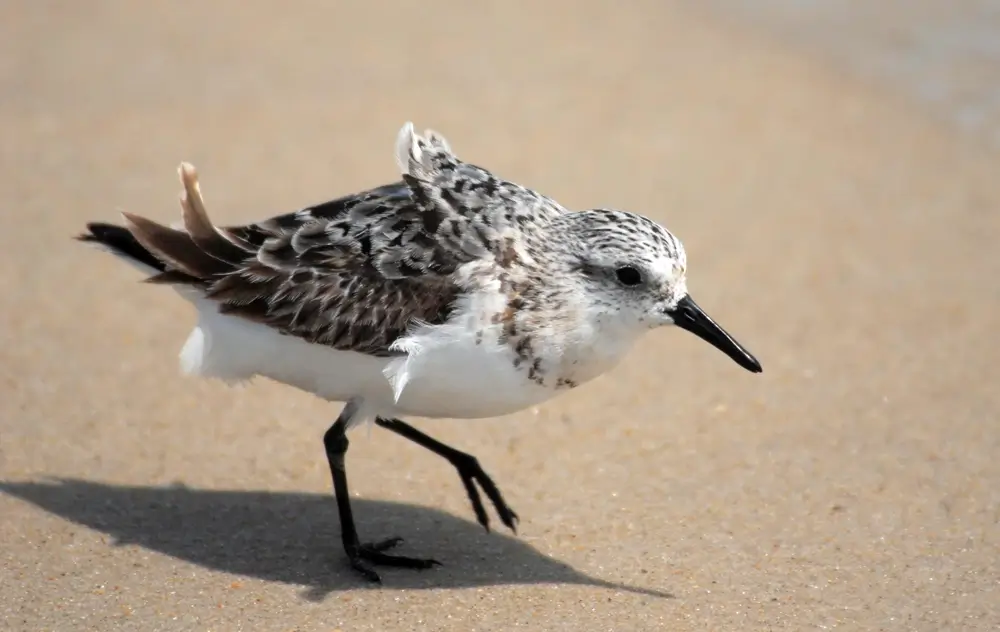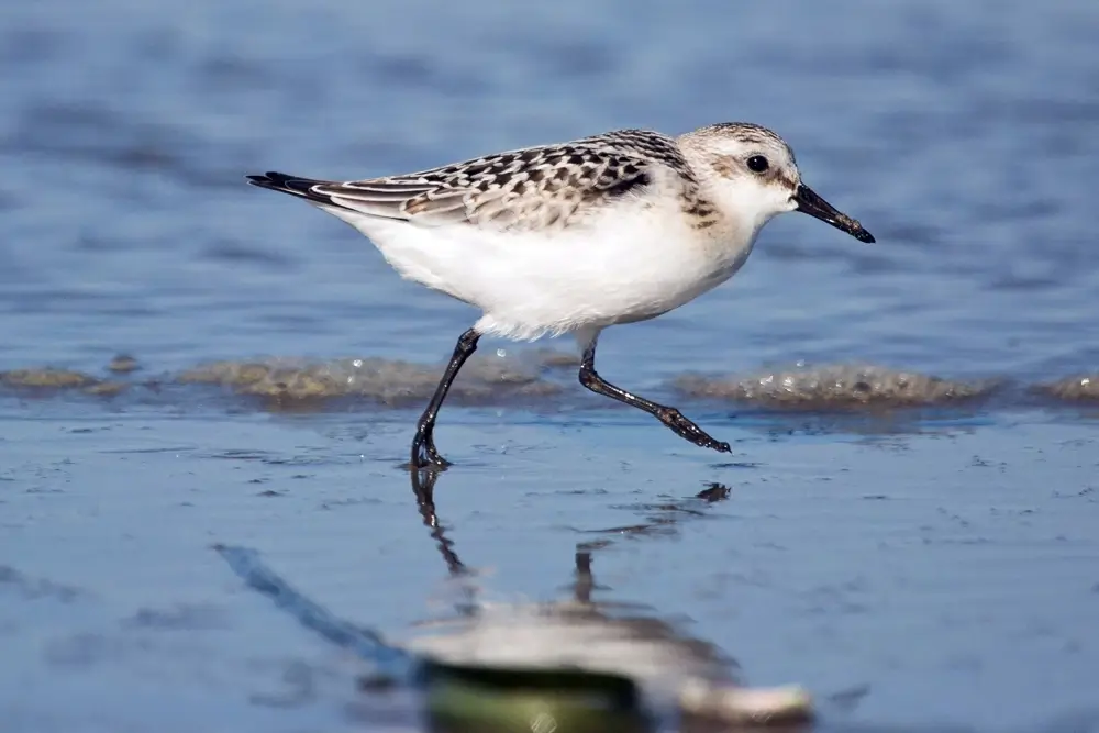 It is speckled brownish-gray on its uppersides and has a dark, pointed bill; black legs; and a white belly. In winter, the sanderling’s plumage turns grayish-white.