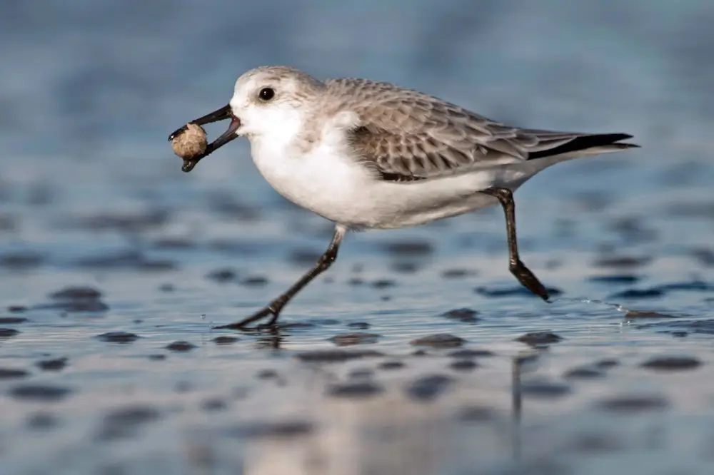 The sanderling eats crustaceans, mollusks, marine worms, and insects.