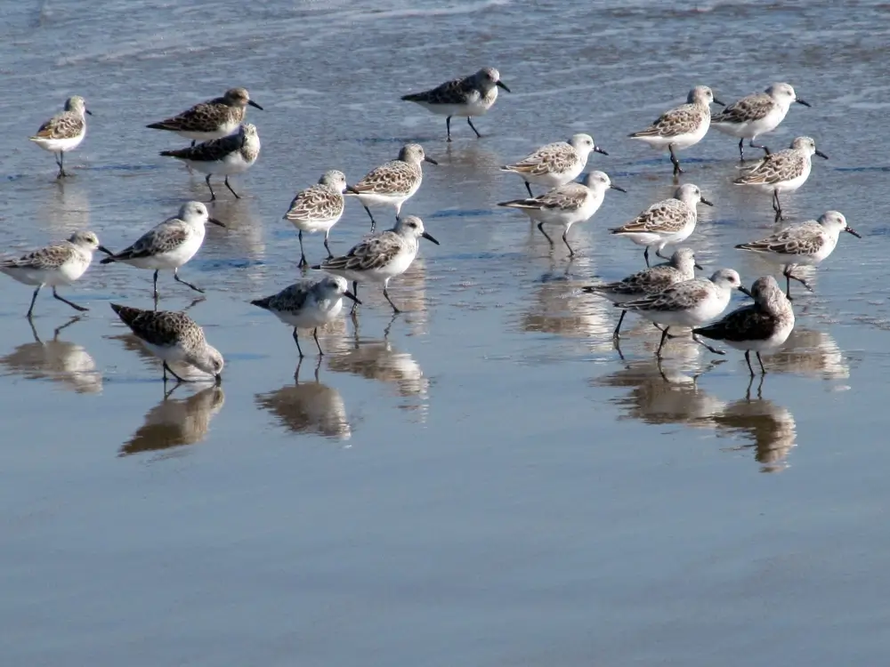 Small groups of sanderlings can often be seen on beaches scurrying after waves as they roll back out to sea. They are actually looking for tiny crustaceans and mollusks exposed by the retreating water.
