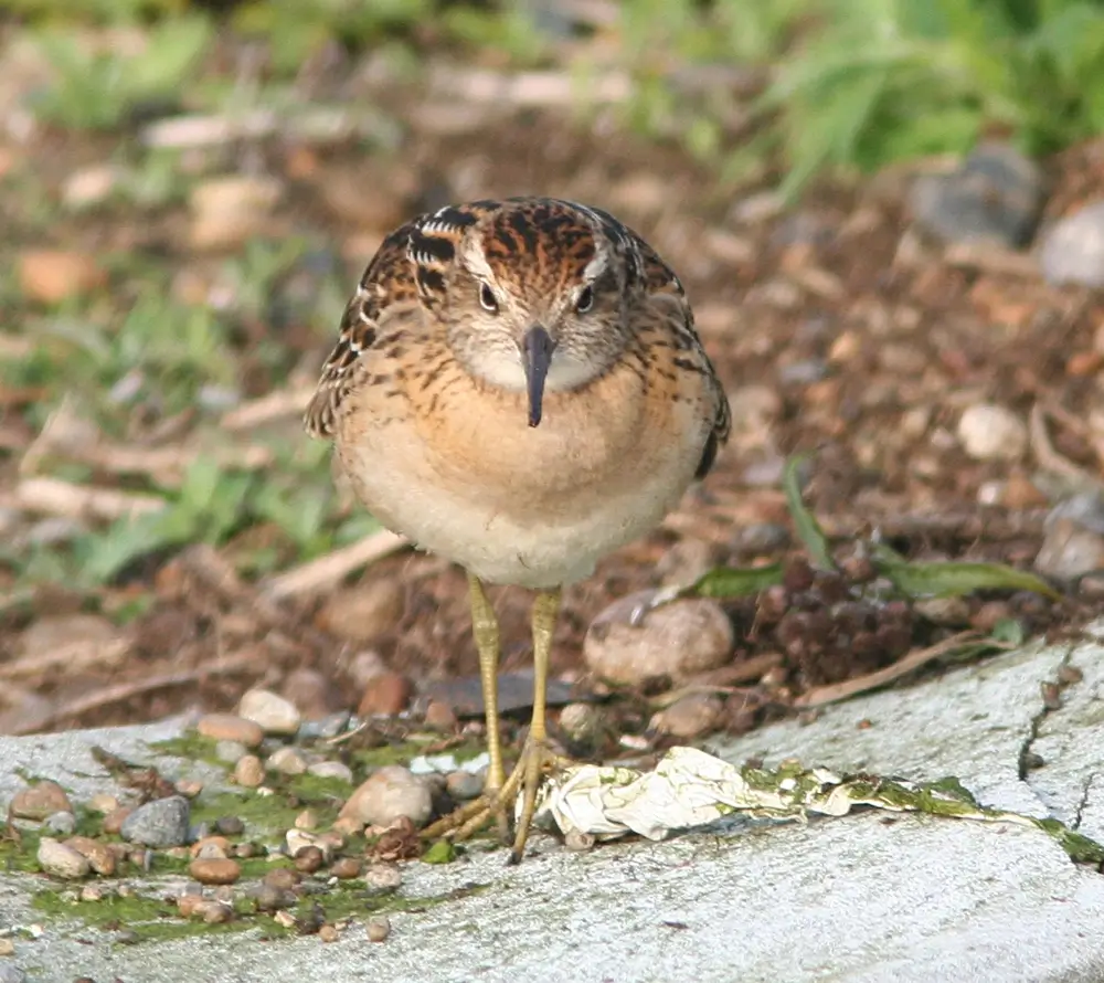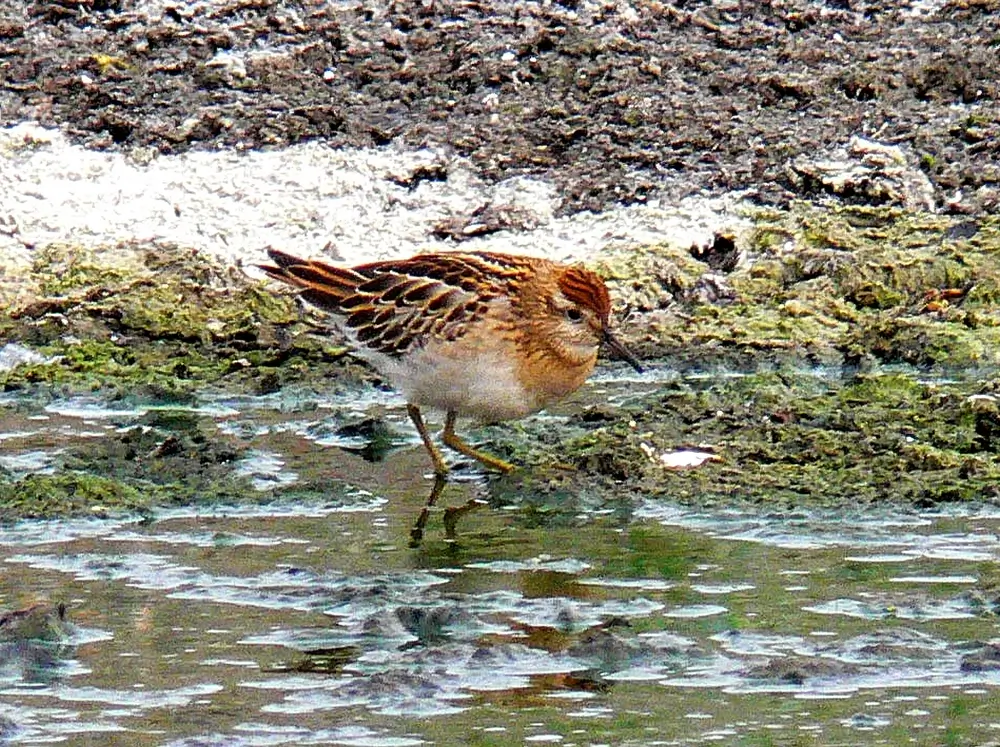 The sharp-tailed sandpiper can be found in grassy areas of coastal marshes and on tidal flats.