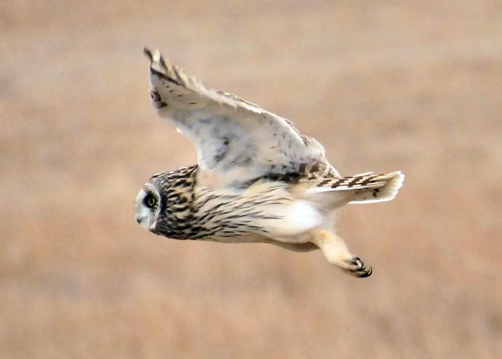 The short-eared owl uses its strong beak and talons to snatch up prey while it is in flight.