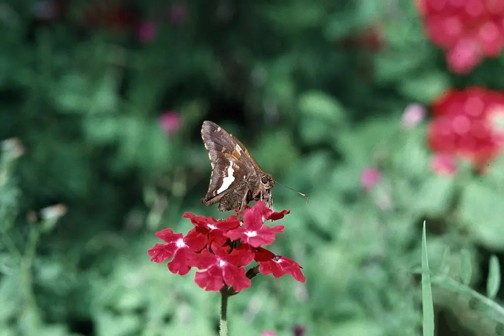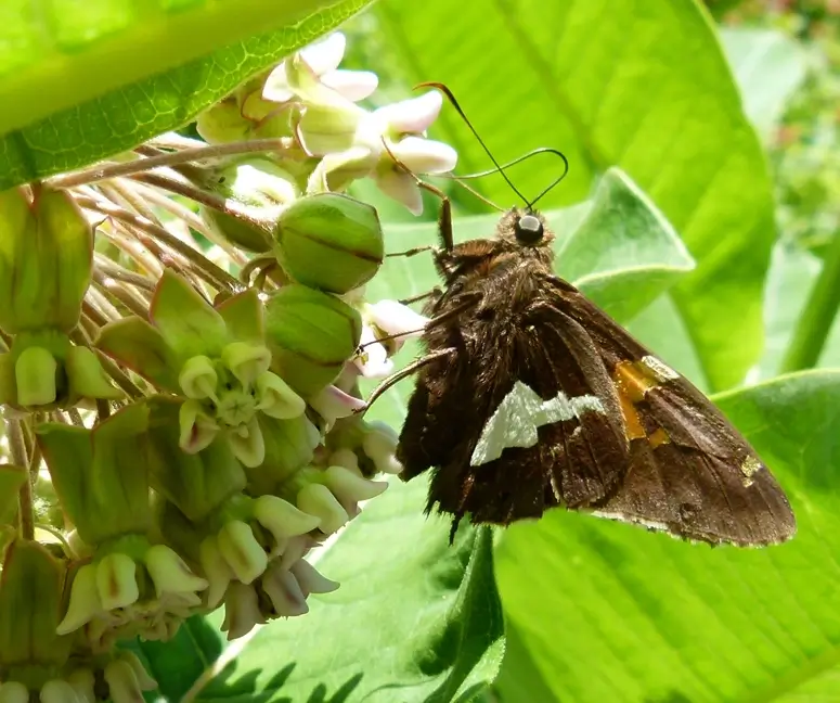 The silver-spotted skipper has a wingspan of 1.5 to 2.5 inches (3.8-5.1 cm). It has sharply pointed, triangular forewings. It is dark brown on its uppersides and undersides.