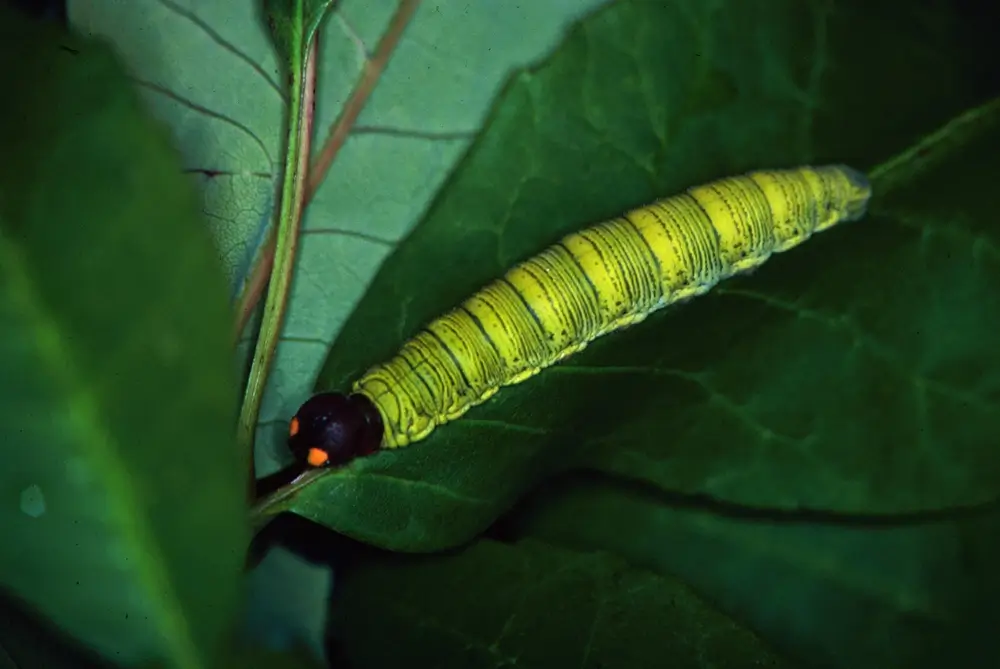 The silver-spotted skipper caterpillar eats plants in the legume or Fabaceae family, especially the black locust, bush clover, and false indigo.