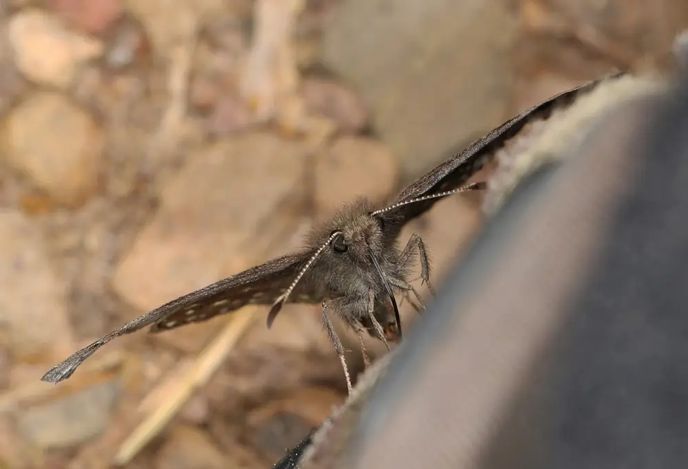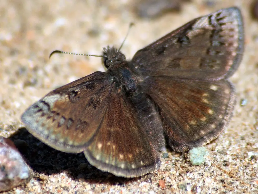 The sleepy duskywing has a wingspan of 1.25 -1.75 inches (3.2-4.4 cm). The upper side of its forewings is dark brown with two zig-zaggy grayish bands bordered in black.