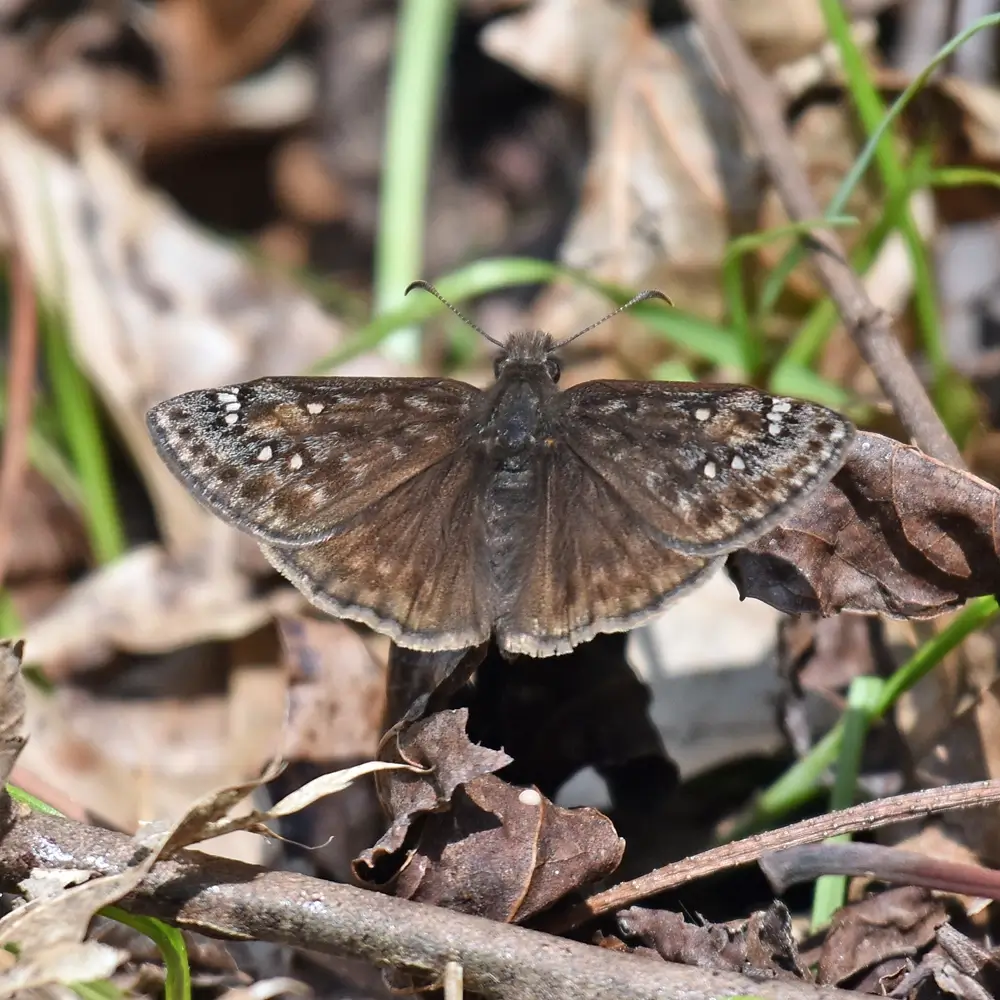 The sleepy duskywing is found in dry rocky, sandy, or brushy areas like roadsides, railroad beds, pine barrens, oak barrens, and recently burned areas.