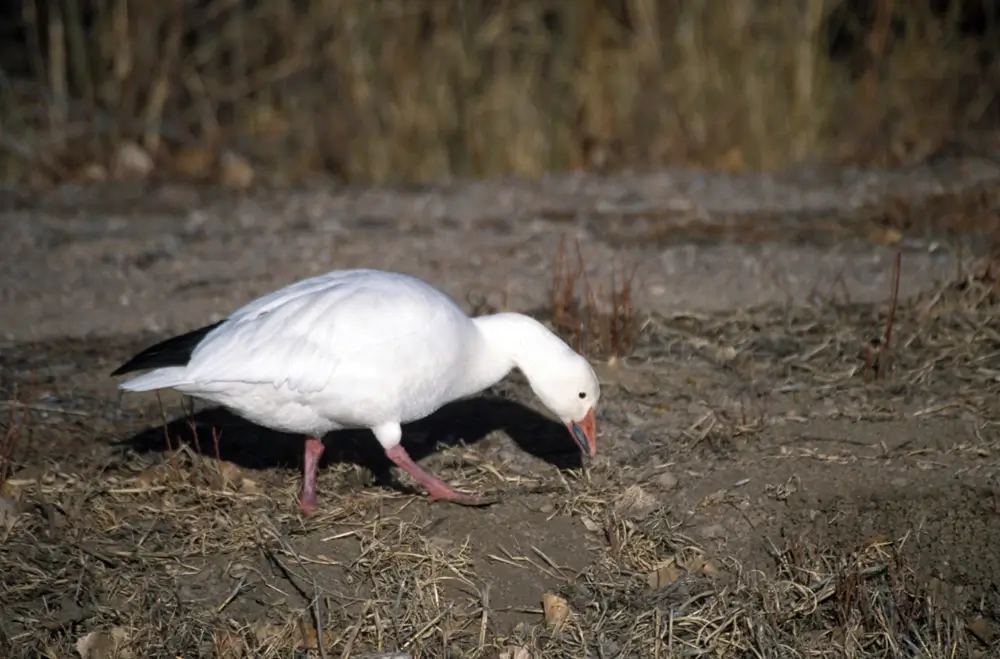 The snow goose will eat all parts of a plant, from seeds, leaves, and stems to tubers and roots. It grazes for seeds and grain above the ground and also grubs around and rips up plants by the roots. In the winter, it feeds on leftover grain and new shoots on farmland.
