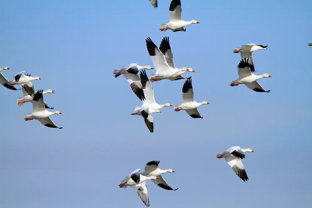 Snow geese migrate in large flocks and fly both night and day. They rest and feed on marshes and other wetlands during their migration. They usually return to the same nesting area each year.