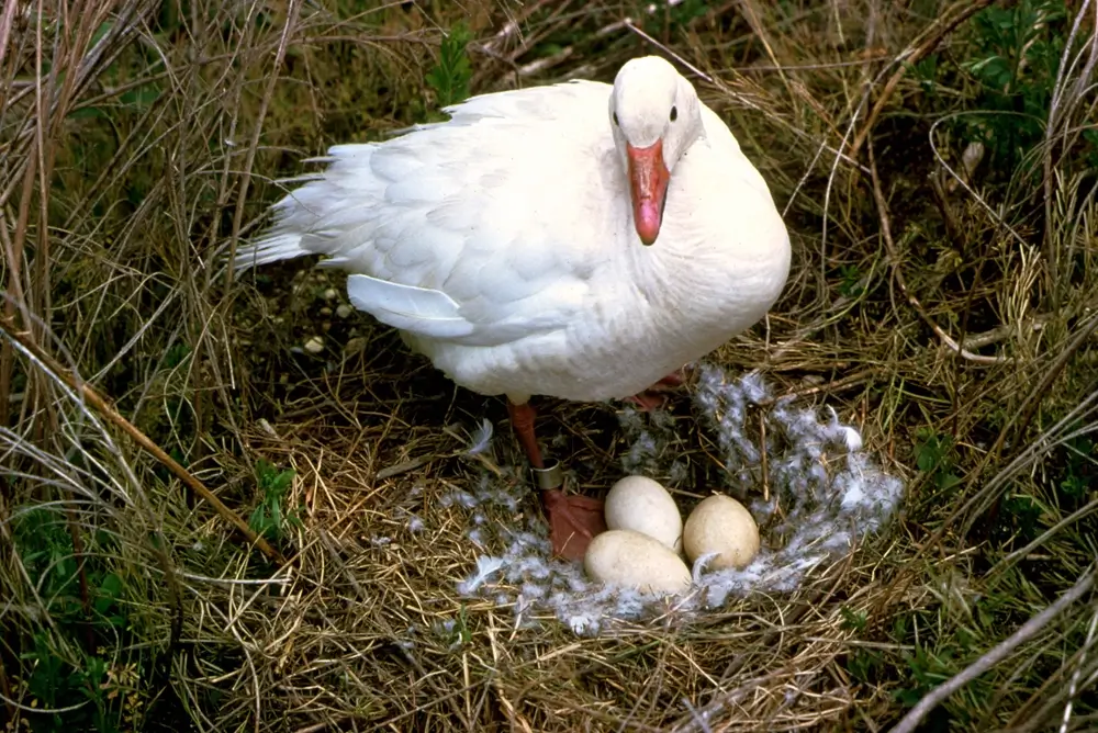 Snow goose pairs form in the spring. It nests in colonies. The female lays 2-5 white eggs in a scrape in the ground lined with dried plant parts and down.