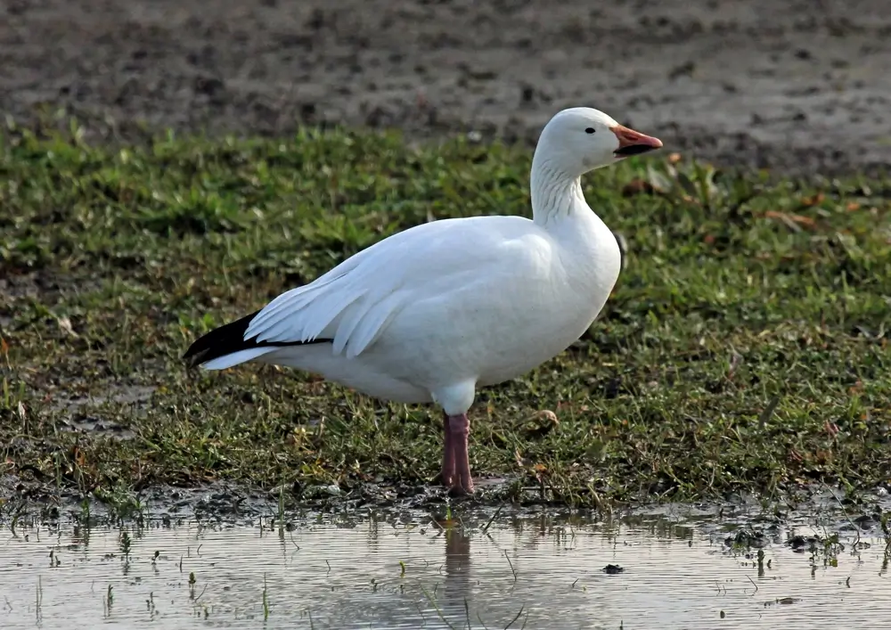 The snow goose breeds on sub-arctic and arctic tundra, near ponds or streams, and winters in coastal saltwater marshes and bays, wet grasslands, freshwater marshes, and fields and farmland.