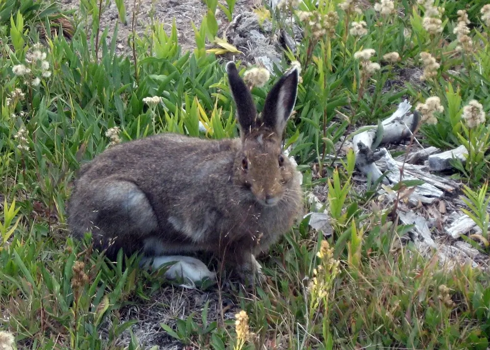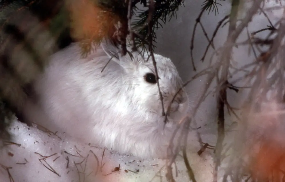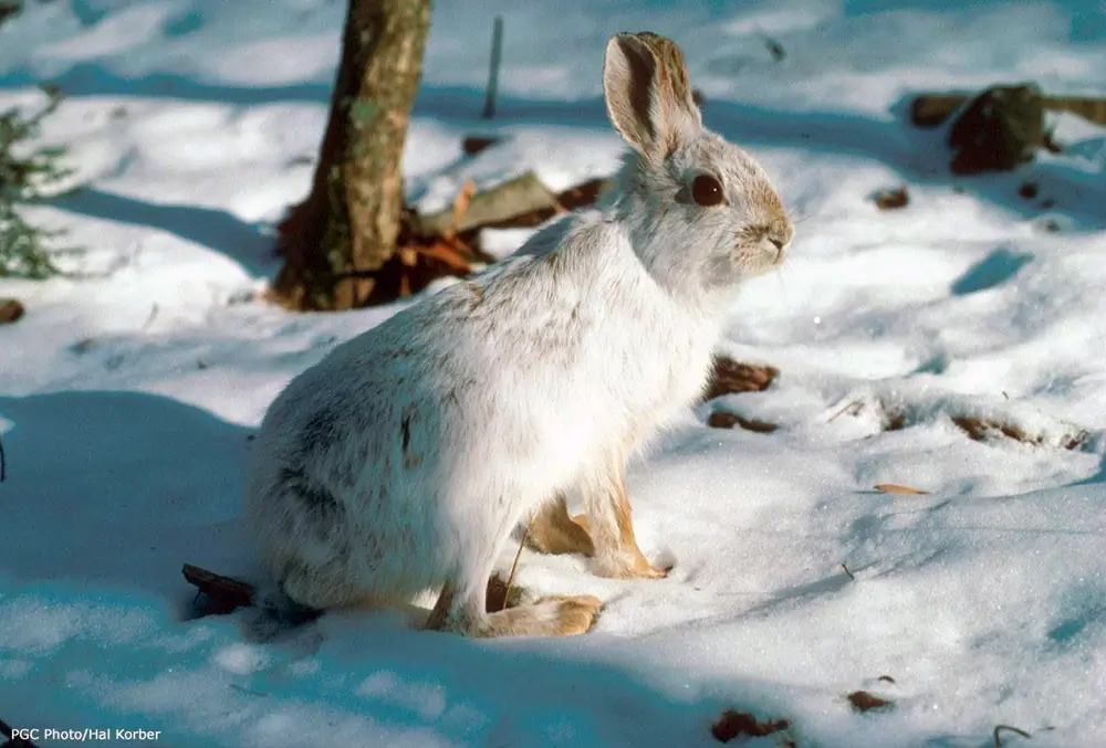 In the summer, the snowshoe hare is grayish brown with a white belly. In the winter, it is completely white except for black eyelids and black tips on its ears.