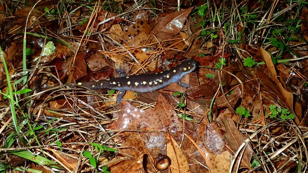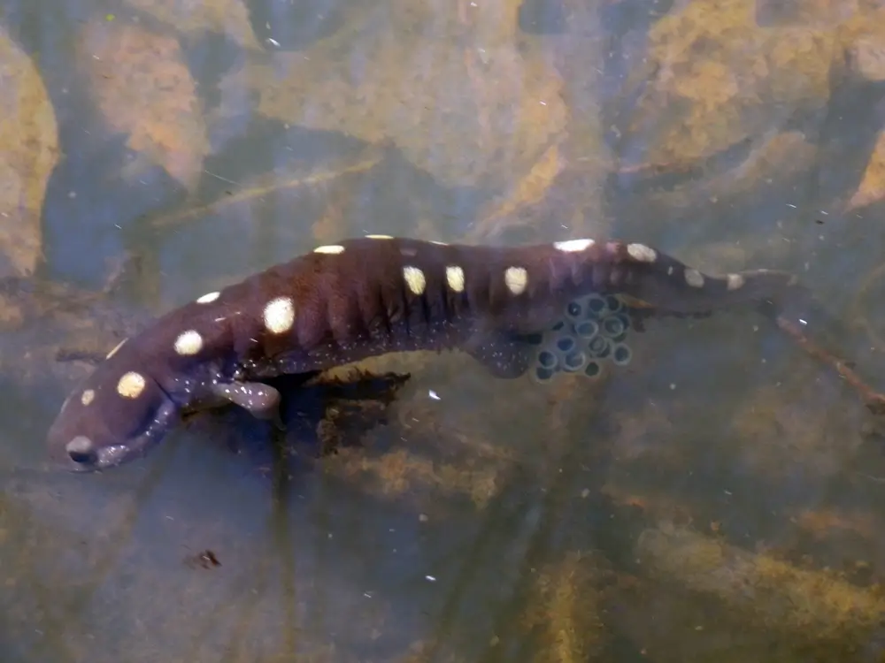 The spotted salamander usually moves to breeding ponds at night during the first rain after the winter thaw. Males arrive at the breeding ponds first.
