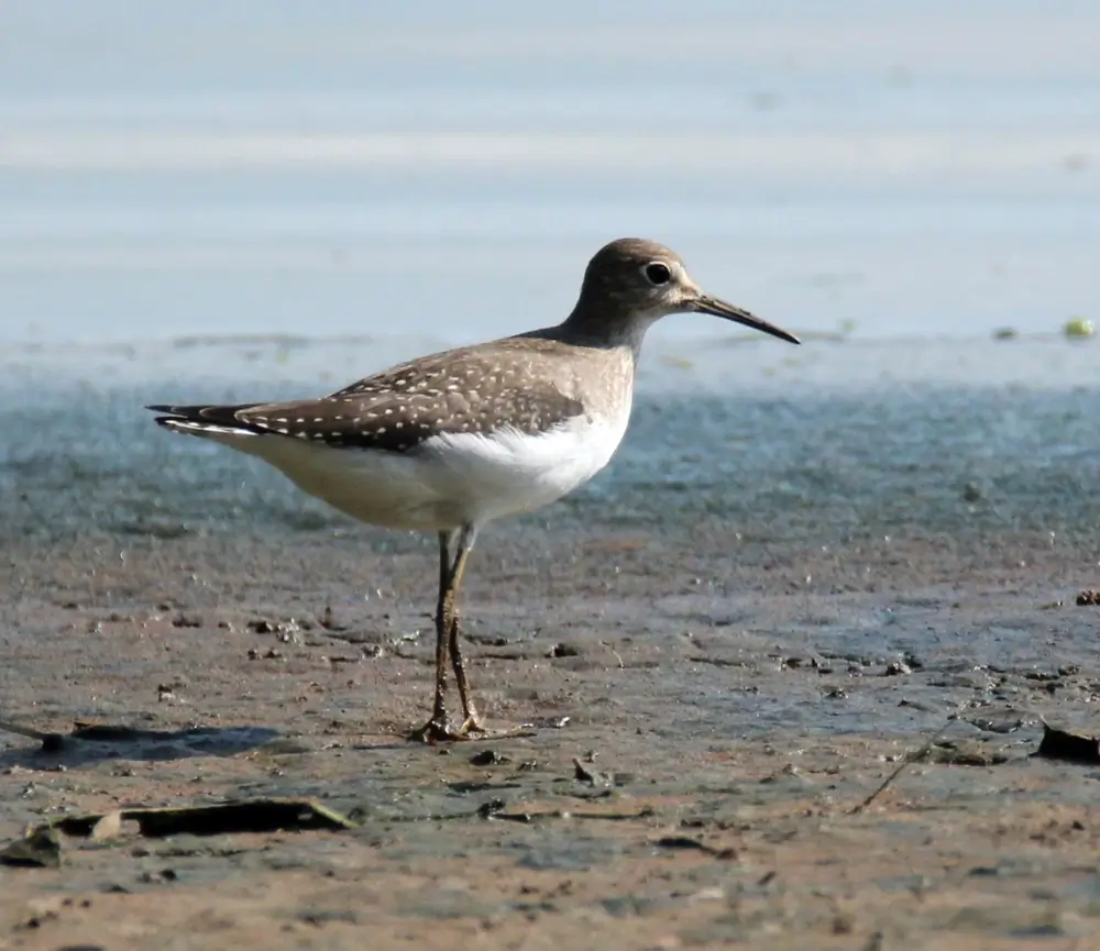 In the winter, the spotted sandpiper has a grayish-brown back and sides and a spotless white breast. Its bill is yellow with a black tip.